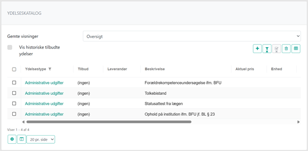 Hvis du skal oprette en administrativ udgift som fx forældrekompetenceundersøgelser, tolkebistand, udgifter til statusattest fra lægen, ophold på institution ifm. BFU § 23 mv., skal du anvende ydelsestypen ”Administrative udgifter”. Ydelsen har ingen tilbudstype eller lovhjemmel. Ydelsen har funktionsnummer 6.45.58. Superbrugere kan oprette ydelserne i ydelseskataloget og fx i beskrivelsesfeltet angive hvilken udgift, det handler om. Herunder finder du et eksempel på, hvordan det kunne se ud.
