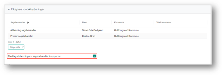 Hvis begge rådgivere skal fremgå af udskriften af afdækningen, skal du markere ”Medtag afdækningens sagsbehandler i rapporten”.