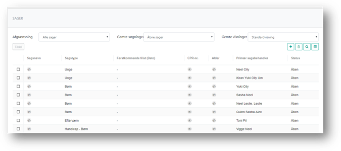 Du kan skifte mellem afgrænsninger på en række oversigter i systemet. Brugervejledningen vil tage udgangspunkt i oversigten ”Sager”, men vil også være gældende for de resterende oversigter.