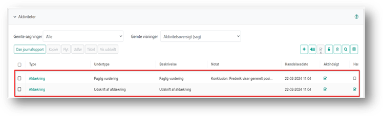 Aktiviteten ’Afdækning – Faglig vurdering’ dannes med status Udført, og vil derfor altid afspejle præcist det, der blev skrevet i afdækningens faglige vurdering. På den måde kan du hurtigt fremsøge den faglig vurdering på en sag.