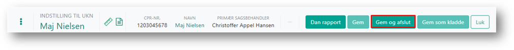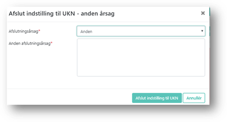 Du kan vælge at afslutte indstillingen til UKN af anden årsag ved at klikke ’Gem og afslut’ uden at have udfyldt alle obligatoriske felter, og dernæst klikke på ’Afslut med anden årsag’.