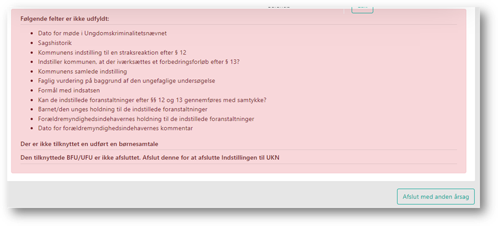 Forsøger du at afslutte Indstilling til UKN, uden at have udfyldt de obligatoriske felter, vises en oversigt over manglende områder i Indstillingen.