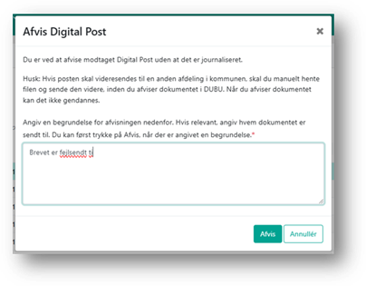 Hvis du modtager Digital post, som fx er sendt forkert og derfor ikke skal journaliseres i DUBU, kan du afvise det. Hvis dokumentet i stedet skal sendes til en anden afdeling i kommunen, er det vigtigt, at du downloader og manuelt sender det til den korrekte afdeling, inden du afviser dokumentet.