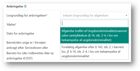 Under ’Lovgrundlag for anbringelsen’ skal du angive det lovgrundlag, der danner baggrund for afgørelsen.