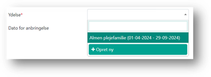 I feltet ’Ydelse’ skal du indsætte anbringelsesydelsen. Du kan enten vælge mellem anbringelsesydelser, som allerede er oprettet på sagen eller du kan oprette en ny anbringelsesydelse ved at klikke på 'Opret ny’. Hvis du ikke kender fx startdato eller anbringelsessted endnu, kan du tilknytte en ydelse i status kladde, og når du kender oplysninger, tilpasser du ydelsen og godkender den. DUBU indberetter først, når aktiviteten er gemt som udført og ydelsen er gemt som godkendt.