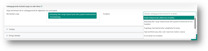 Under området ’Udslagsgivende forhold’ skal du angive hvilke forhold der er udslagsgivende for afgørelsen om anbringelse af barnet/den unge. Det gør du ved at klikke på feltet og vælge minimum et forhold for enten barnet/den unge eller forældre, men du har også mulighed for at angive flere forhold. For at indsætte flere forhold i ét felt, skal du klikke i feltet igen, og vælge de(n) relevante forhold.