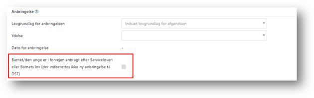 Når du har valgt eller oprettet en anbringelsesydelse, udfyldes feltet ’Dato for anbringelse’ automatisk med ydelsens startdato. Denne dato indberettes til anbringelsesstatistikken. Desuden indberettes tilbudstypen og beliggenhedskommune fra den valgte ydelse også, samt eventuelt oplysninger om leverandøren.