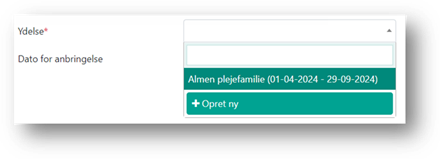I feltet ’Ydelse’ skal du indsætte anbringelsesydelsen. Du kan enten vælge mellem anbringelsesydelser, som allerede er oprettet på sagen eller du kan oprette en ny anbringelsesydelse ved at klikke på 'Opret ny’. Hvis du ikke kender fx startdato eller anbringelsessted endnu, kan du tilknytte en ydelse i status kladde, og når du kender oplysninger, tilpasser du ydelsen og godkender den. DUBU indberetter først, når aktiviteten er gemt som udført og ydelsen er gemt som godkendt.