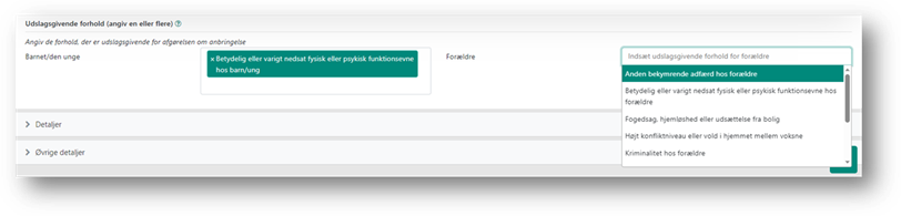 Under området ’Udslagsgivende forhold ’ skal du angive hvilke forhold der er udslagsgivende for afgørelsen om anbringelse af barnet/den unge. Det gør du ved at klikke i feltet og vælge minimum et forhold for enten barnet/den unge eller forældre, men du har også mulighed for at angive flere forhold. For at indsætte flere forhold i ét felt, skal du klikke i feltet igen, og vælge de(n) relevante forhold.