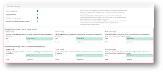Selvom felterne om automatisk indberetning til ’Statistik for indsatser og støtte’ og ’Statistik for handicapkompenserende indsatser’ er markeret, vil der først ske indberetning, når du har angivet kontaktoplysninger på de ansvarlige personer statistikkerne.
