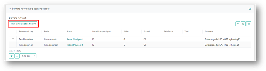 Hvis der via CPR er registreret andre familierelationer, som søskende og stedforældre, kan disse let oprettes i netværket, hvis de er relevante for sagen. Du tilføjer personer med familierelationer ved at klikke på knappen ’Tilføj familierelationer fra CPR’.