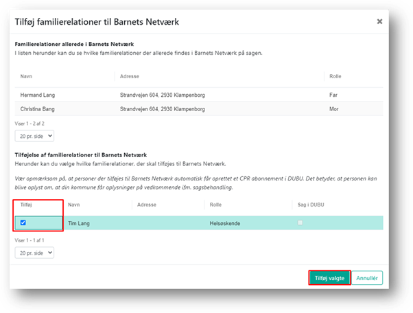 DUBU åbner et vindue hvor du kan se alle barnet/den unges familierelationer, som findes via CPR. Du får både et overblik over de familierelationer, der allerede findes på sagen og relationer der kan tilføjes. Når du har markeret hvilke personer, som er relevante at tilføje, klikker du på ’Tilføj valgte’.