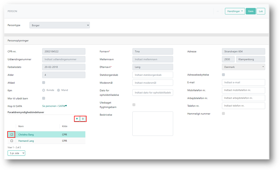 Hvis du ønsker manuelt at ændre forældremyndighed over barnet, gøres dette på listen ’Forældremyndighedsindehaver’ fra personsiden. En forældremyndighedsindehaver tilføjes ved at klikke på + eller slettes ved at klikke på skraldespandsikonet. Når du opretter forældremyndighed, skal du angive hvilken kilde, som du har oplysninger om forældremyndighed fra.