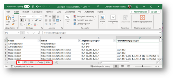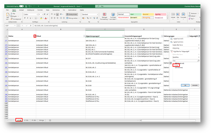 Eksempel: Kontaktperson bevilliget efter Barnets lov. Du vælger arket ’BL’. På kolonnen ’Ydelse’ vælger du ’Kontaktperson’ i filteret. Dernæst er det en god idé at frasortere ’følgeudgifter’ ved at fjerne de ydelser med ’x’ i følgeudgifter. Det sikrer at den samme lovhjemmel ikke fremgår to gange.