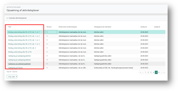 Du åbner en aktivitetsplan ved at klikke på linket i kolonnen Titel.