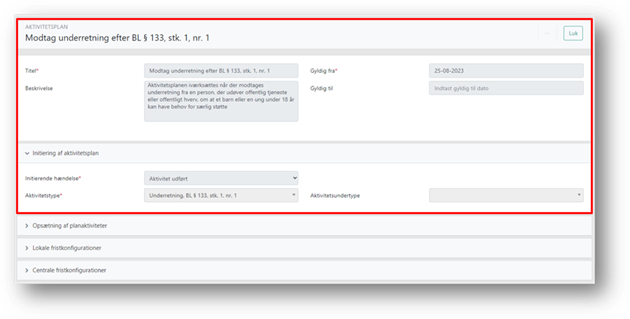 Da der er tale om en central aktivitetsplan er det ikke muligt for dig som kommunal superbruger at redigere dens stamdata (Titel, Beskrivelse mv.) og igangsættende hændelse, dvs. hvilken hændelse der skal gøre at aktivitetsplanen bliver iværksat. Hvad du har mulighed for at gøre inde på siden, vil blive beskrevet i følgende afsnit.