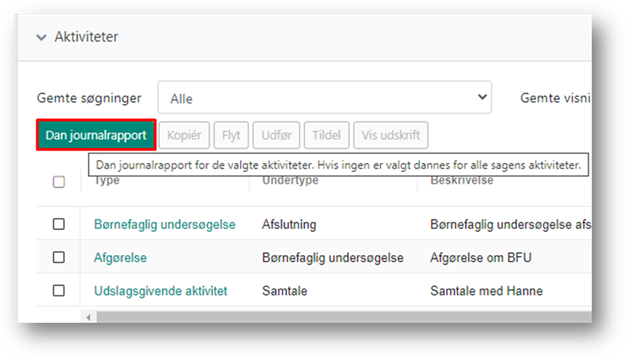 Du kan danne en journalrapport over alle aktiviteter på sagen eller for en bestemt periode ved at klikke på knappen ’Dan journalrapport’.