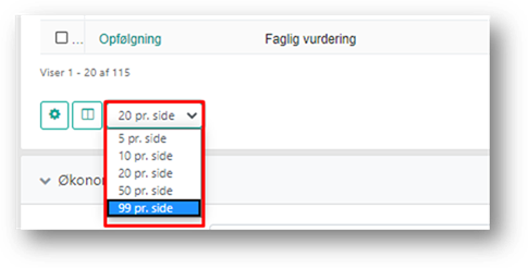 Hvis du ved fremsøgning/visning af aktiviteter får flere aktiviteter på listen end der som standard vises på aktivitetslisten, kan du ændre visningen, så der vises op til 99 aktiviteter pr. side.