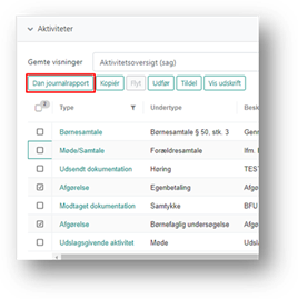 Du har også mulighed for at danne en journalrapport ved at udvælge en række aktiviteter fra aktivitetsoversigten på sagen. Du kan udvælge aktiviteterne ved fx at filtrere aktiviteterne frem ud fra eksempelvis Type eller Undertype.