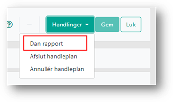 Hvis du har behov for at danne en handleplansrapport, som kun indeholder dele af planen, kan du danne en specificeret handleplansrapport. Det gør du ved at klikke på Handlinger og vælge Dan rapport. Du kan benytte denne funktion til at danne en handleplansrapport til fx partshøring, eller til at oprette en rapport til en leverandør af foranstaltning, hvor noget indhold skal udelades fra rapporten.