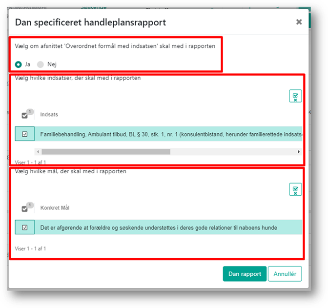 Når du har klikket på Dan rapport åbnes en boks, hvor du kan angive om afsnittet ’Overordnet formål med indsatsen’ skal medtages i rapporten, samt vælge, hvilke indsatser og mål der skal indgå i handleplansrapporten.