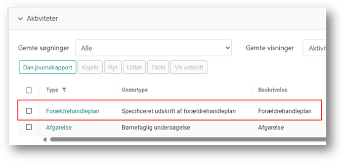 Når du klikker på ’Dan rapport’, dannes en rapport, der lægges på aktiviteten med typen ”Forældrehandleplan” – ”Specificeret udskrift af forældrehandleplan”.