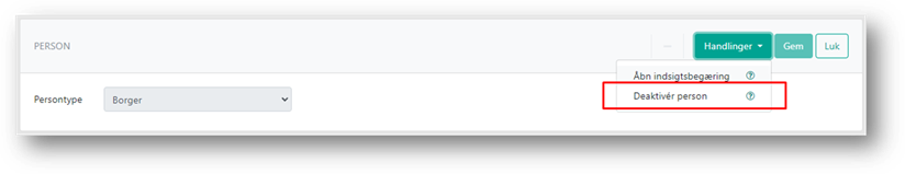 For at deaktivere en person, skal du åbne personen, og i menuen Handlinger vælge ’Deaktiver person’