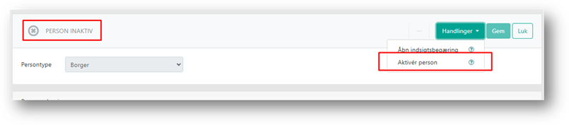 På inaktive personer, kan du i menuen Handlinger aktivere personen igen. Det er nødvendigt at genaktivere en person, hvis personen skal tilknyttes en sag, eller hvis du skal genåbne en sag, hvor personen indgår i Barnets netværk.