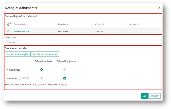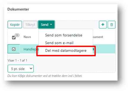 Du markerer den eller de dokumenter på aktiviteten, der skal deles, og klikker på Del med datamodtagere.