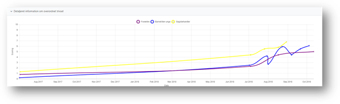 Herunder ses et eksempel på en graf, for trivselsels angivelser, indeholdende barnet/den unge, forældres og sagsbehandlerens trivselsscoringer.