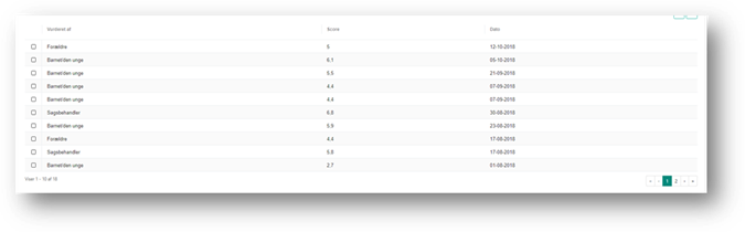 Under grafen kan du se en liste hvor du kan se de enkelte scorer, med kolonnerne: Vurderet af, Score og Dato.