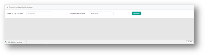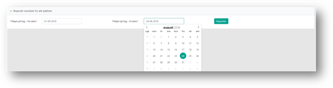 Uanset om du eksporterer resultater fra tjeklisteoversigten eller fra den enkelte tjekliste, skal du angive en periode i felterne Tilføjet på sag – fra-dato og Tilføjet på sag – til-dato. Og trykke på knappen Eksportér.