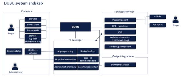 I nedenstående illustration er skitseret nogle af de systemer, der har indflydelse på funktioner i DUBU. Dette indebærer programmer installeret i kommunen, samt den fælleskommunale infrastruktur. DUBU modtager fx oplysninger om navn og rettighed på brugere via Adgangsstyring, afleverer oplysninger om sager til Sags og Dokumentindekset, og foretager forsendelser via Serviceplatformens Postkomponent.