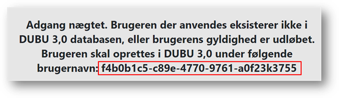Såfremt en bruger er oprettet i kommunens Adgangsstyring, men ikke kan findes i DUBU, vil brugeren få følgende fejl.