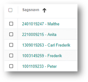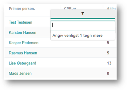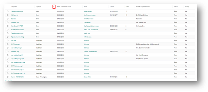 ”Fritekstfiltrering” finder du blandt andet på kolonnen ”Primær person”, hvor du kan skrive det navn, du leder efter. Bemærk, at når du filtrerer i kolonnen ”Primær person” på listen over sager, vil du kun få vist personer på sager du har læse-adgang til.