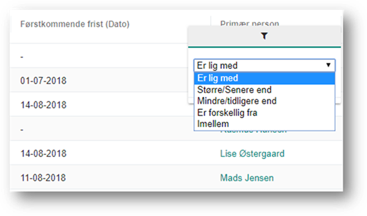 ”Datofiltrering” kan du blandt andet finde på kolonne ”Først kommende frist” (dato). Her vælger du, hvilken filtrering datoen skal sammenligne med.