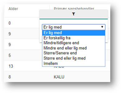 ”Talfiltrering” finder du blandt andet på kolonnen ”Alder”. Her skriver du et tal og vælger, hvad tallet skal filtreres efter.