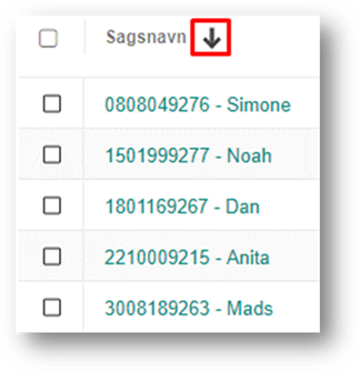 Du sorterer ved at klikke i kolonneoverskriften og en pil øverst i kolonnen viser, om sorteringen er stigende eller faldende.