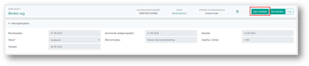 Når du åbner detaljevisningen for en stoppet merudgiftsydelse, kan du se ydelsens slutdato, og knappen til at fjerne slutdatoen.