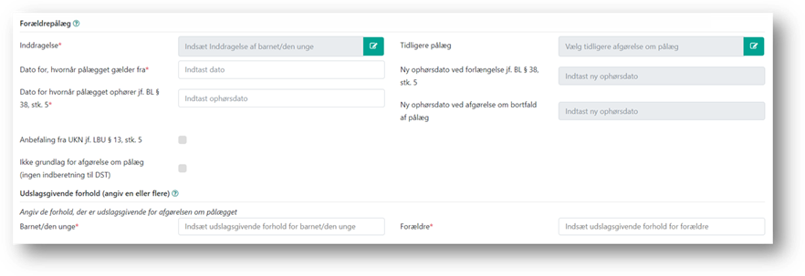 Du skal angive datoen for, hvornår pålægget gælder fra, samt datoen for hvornår pålægget ophører. Endvidere skal der tilknyttes en inddragelse af barnet/den unge, da barnet/den unge skal inddrages inden afgørelse om pålæg. Derudover skal du angive et eller flere udslagsgivende forhold for barnet/den unge og/eller forældre. Er der mere end et forhold, som danner baggrund for afgørelsen, er det vigtigt at du angiver dem alle, da oplysningerne indberettes til DST.