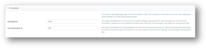 DUBU anvender Serviceplatformens printløsning til forsendelser. Hvis din kommune vil afsende breve via digital post eller via kommunens fjernprintløsning, skal du registrere en række ID’er under fanen Forsendelser på siden for Kommunal administration: