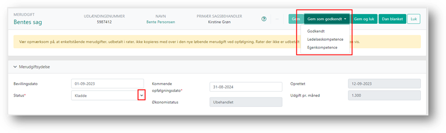 Når alle merudgifter er oprettet og minimumsgrænsen er oversteget, kan du godkende merudgiftsydelsen. Du godkender ved at klikke på ’Gem som godkendt’ i menuen eller ved at ændre status på ydelsen.