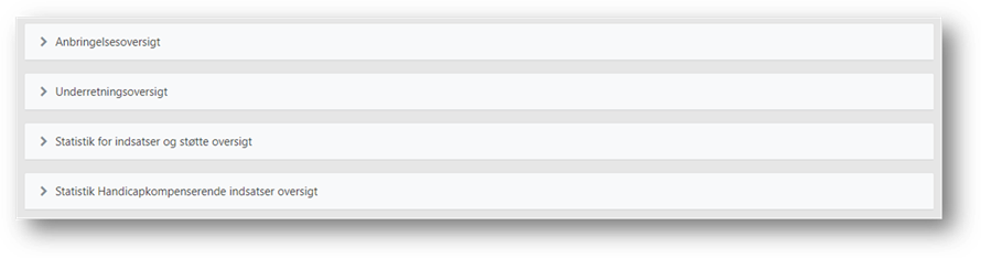 Indberetningsoversigten er delt ind i fire faner, efter indberetningstype: Anbringelsesoversigt, underretningsoversigt, Statistik for indsatser og støtte oversigt og Statistik Handicapkompenserende Indsatser oversigt.