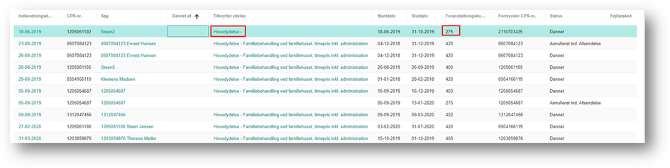 Klikker du på linket i kolonnen ’Tilknyttet ydelse’ åbnes den ydelse, som indberetningen er dannet på baggrund af.