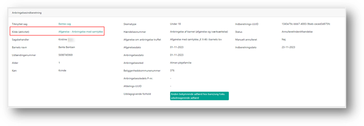 Hvis indberetningen er annulleret, kan du se på detaljesiden om den er blevet manuelt annulleret af en superbruger. Dette kan også ses på den anbringelsesaktivitet som indberetningen er lavet på.