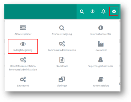 Du kan åbne indsigtsbegæring fra to steder i systemet, enten fra Indsigtsbegæringer via tandhjulet i navigationsbjælken.