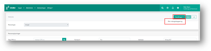 Eller fra en personside hvor du skal trykke på knappen Handlinger og vælge Indsigtsbegæring.