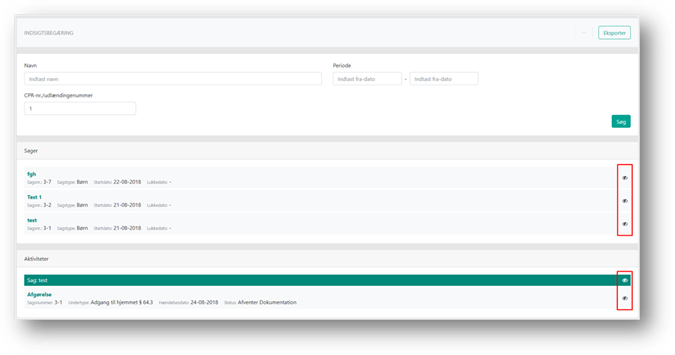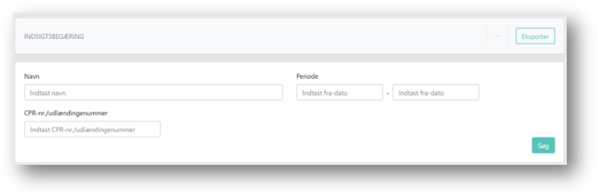 Systemet åbner indsigtsbegæringssiden. Har du åbnet siden fra Indsigtsbegæring under Indstillinger, kan du fremsøge alle de oplysninger, der er registreret i systemet om en given person ved at angive personens navn og/eller cpr-/udlændingenummer. Har du åbnet indsigtsbegæringssiden fra personsiden, er oplysninger som cpr-udlændingenummer og navn præudfyldt af systemet. Herefter klikker du på Søg knappen.