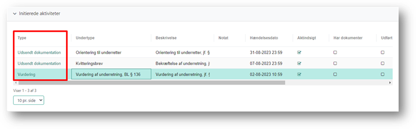 I kolonnen ”Type” er der links til de aktiviteter der er blevet initieret.