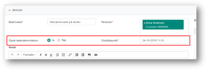 Fra aktiviteten er det muligt at oprette en aftale i din kalender via ”Kalenderinvitation”, fx hvis der er tale om et planlagt møde. Som udgangspunkt er formålet, at du kan få aftalen i din egen kalender, men det er også muligt at invitere kollegaer eller samarbejdspartnere. Forældre og barnet/den unge bør ikke inviteres til møder via denne kalenderinvitation.